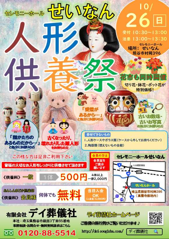 さて、今月は村岡にありますセレモニーホールせいなんにて第2回人形供養祭を開催することとなりました。前回はたくさんの方にお越し頂き、大切な人形等を高雲寺様にてご供養していただきました。
