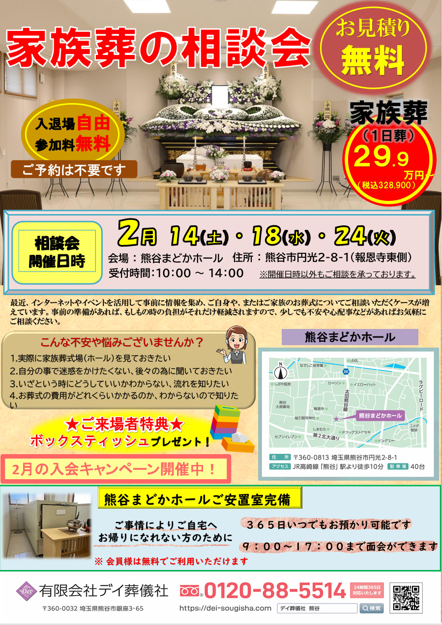 今月も熊谷まどかホールでは、家族葬の相談会を開催させていただきます。