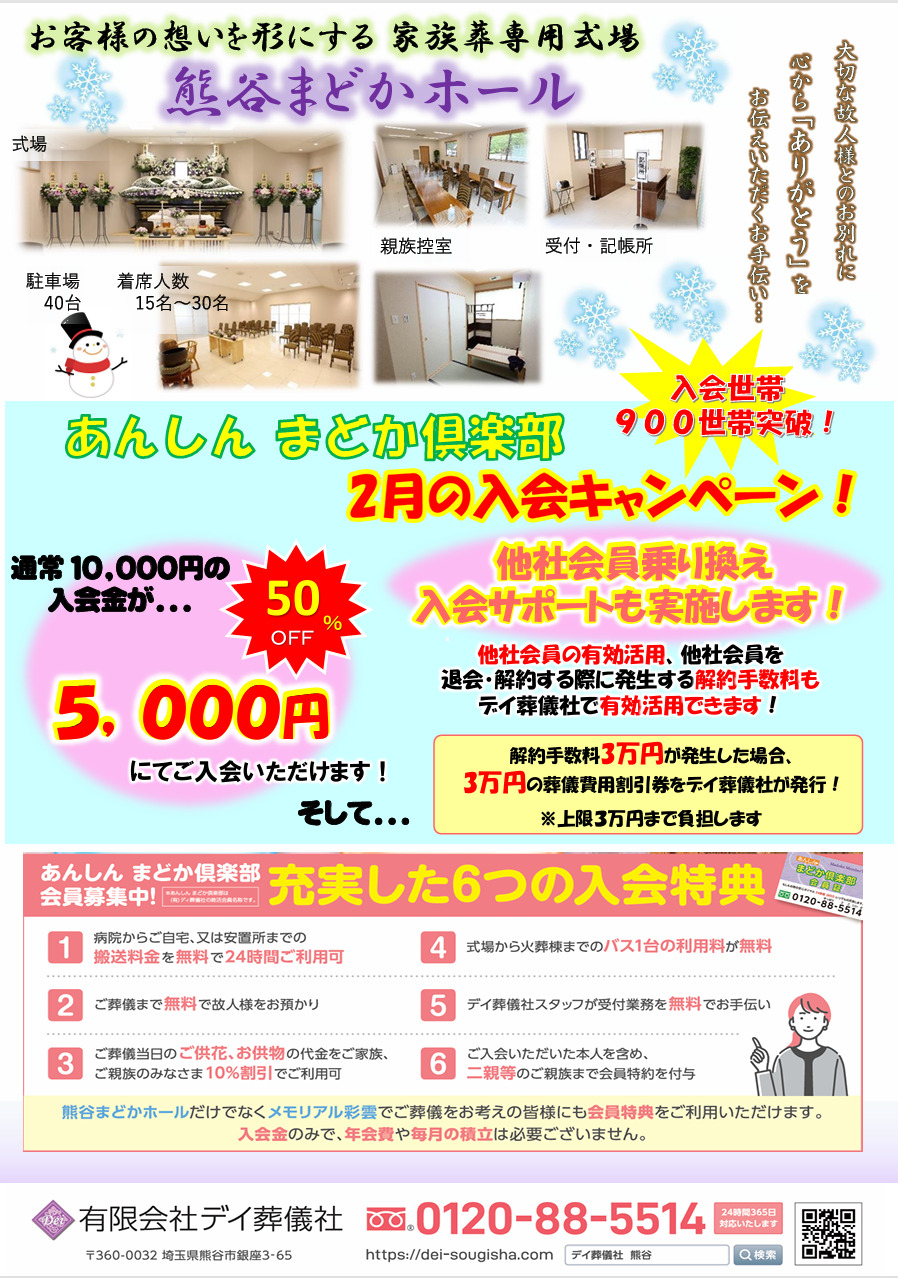 皆様の家族葬についての疑問やご質問に弊社スタッフがお答えいたしますので、お時間ご都合いただきご来場下さい。また、当日は弊社の会員制度「あんしんまどか倶楽部」への入会がお得に!なんと、通常10,000円の入会金が50%OFFの5,000円でご入会いただけますので、この機会のご入会をお勧め致します。